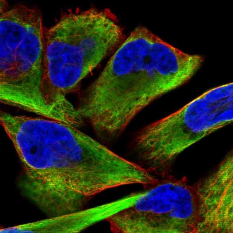 The cytoskeleton consists of three types of cytosolic fibers: microfilaments (actin filaments), intermediate filaments and microtubules. Major types of intermediate filaments are distinguished and expressed in particular cell types: cytokeratins (epithelial cells), glial fibrillary acidic protein or GFAP (glial cells), desmin (skeletal, visceral and certain vascular smooth muscle cells), vimentin (mesenchyme origin) and neurofilaments (neurons). GFAP and vimentin form intermediate filaments in astroglial cells and modulate their motility and shape. In particular, vimentin filaments are present at early developmental stages, while GFAP filaments are characteristic of differentiated and mature brain astrocytes. Thus, GFAP is commonly used as a marker for intracranial and intraspinal tumors arising from astrocytes. Vimentin is present in sarcomas, but not carcinomas, and its expression is examined relative to other markers to distinguish between the two forms of neoplasm. Desmin is a myogenic marker expressed in early development that forms a network of filaments that extends across the myofibril and surrounds Z discs. The desmin cytoskeleton provides a connection among myofibrils, organelles and the cytoskeleton. Desmin knockout mice develop cardiomyopathy, skeletal and smooth muscle defects. In humans, desmin related myopathies might be caused by mutations in the corresponding desmin gene or in proteins with which desmin interacts, including αB-crystallin and synemin. Disorganized desmin filaments and the accumulation of protein aggregates comprised predominantly of desmin characterize desmin-related myopathies.