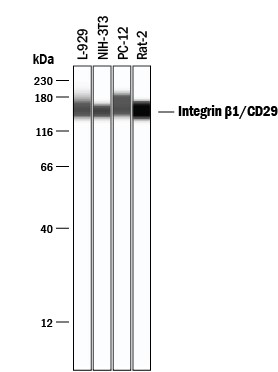 The β1 subfamily includes 12 distinct integrin proteins that bind to different extracellular matrix molecules. Control of extracellular integrin binding influences cell adhesion and migration, while intracellular signaling messages relayed by the β1 cytoplasmic tail help to regulate cell proliferation, cytoskeletal reorganization, and gene expression. Research studies have implicated β1 integrin in various activities including embryonic development, blood vessel, skin, bone, and muscle formation, as well as tumor metastasis and angiogenesis.